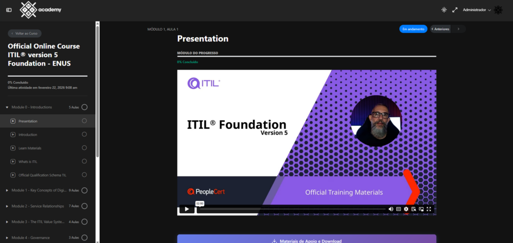 O curso ITIL Foundation Version 5 é a porta de entrada para o mundo da gestão de serviços digitais moderna. Desenvolvido com base nos materiais oficiais da PeopleCert, esta formação abrangente oferece os conhecimentos fundamentais para entender, aplicar e otimizar as práticas de ITIL em qualquer organização. Você aprenderá a criar e entregar valor através de produtos e serviços digitais, gerenciar riscos, custos e resultados, e integrar as melhores práticas de governança e melhoria contínua. Prepare-se para impulsionar sua carreira e transformar a forma como sua organização entrega valor na era digital.